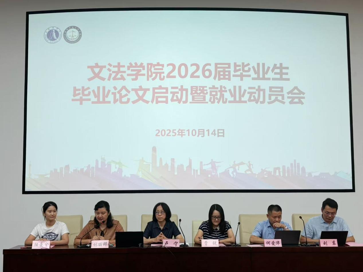 2025年10月14日,文法学院在中山西路校区3楼报告厅组织召开2026届毕业生毕业论文启动暨就业动员大会。院长卢宁,副院长曹锐,党总支副书记、副院长林丽娜,法学系系主任何爱华,社会工作系系主任刘东,2022级辅导员陆曼兮出席会议。会议由林丽娜老师主持。