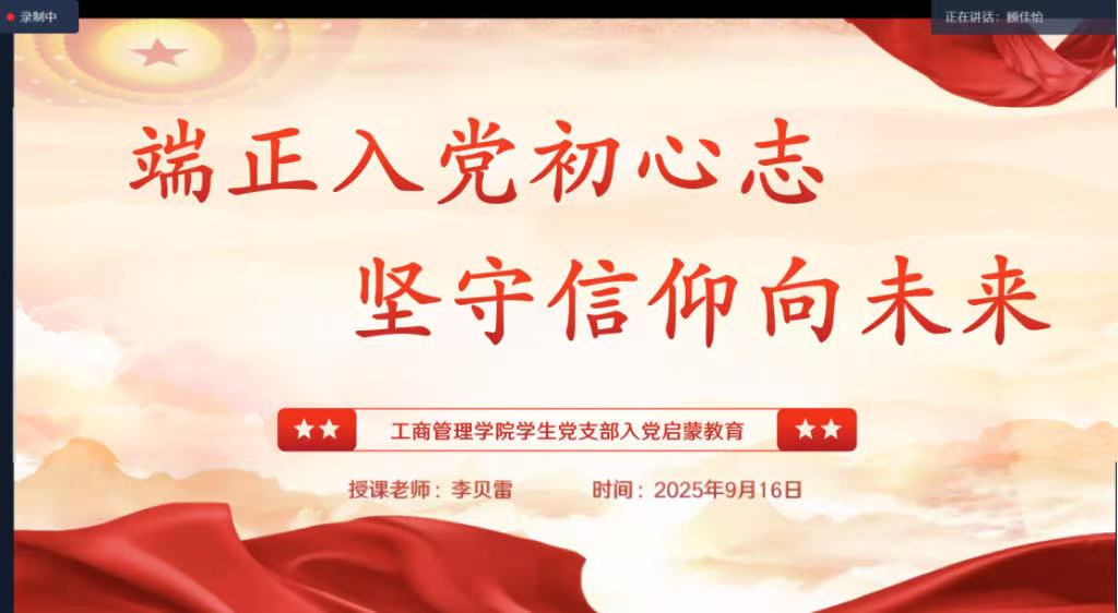 为深入学习贯彻习近平新时代中国特色社会主义思想,帮助2025级新生扣好“思想成长的第一粒扣子”,引导青年坚定理想信念,树立正确入党动机,主动向党组织靠拢。工商管理学院学生党支部于9月16日开展“端正入党初心志,坚守信仰向未来”新生入党启蒙教育专题课。本次党课由工商管理学院党总支组织员李贝雷主讲,2025级全体新生参加。