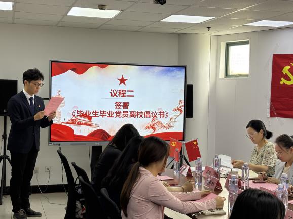 党总支组织委员杨凤美向即将踏上新征程的毕业生党员们表达殷切期望。她深情回顾了毕业生党员们在大学期间的成长历程,从青涩懵懂到成熟稳重,从对党的知识一知半解到成为坚定的共产党员,每一步都离不开党组织的悉心培养和同学们自身的不懈努力。她指出,无论大家未来奔赴何方、从事何种工作,学院永远是每一位党员最温暖的港湾,这里承载着大家奋斗的青春记忆、师长的谆谆教导和深厚的同窗情谊。学院永远是毕业生党员们坚实的后盾,将一如既往地关注、支持大家的成长与发展,也衷心祝愿全体毕业生党员在未来的人生道路上一帆风顺,前程似锦。在学院寄语环节后,毕业生党员代表踊跃发言,饱含对母校的感恩之情,提及在校期间党组织的培养与关怀,感慨学院为其成长提供的平台和支持。全体毕业生定不负期望,以实际行动回报学校,在新征程中践行党员使命。他们纷纷表示,将牢记党组织的嘱托,把在大学期间学到的知识和培养的能力运用到实际工作中,为实现中华民族伟大复兴的中国梦贡献自己的力量。