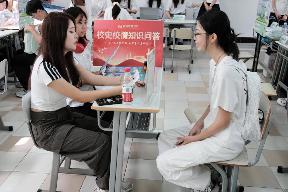 为更好传承学校文化底蕴、回顾光辉历史、展望美好未来,酒店管理学院开展“萌新寻光记”任务打卡活动,在新生报到现场特设“七十五载风华路,知识争锋启新程”——校史校情知识问答活动。新生报到现场,负责该活动的同学手持问题卡对新生进行提问,同学们或自信应答,或认真思考,在问答互动中进一步加深了对学校的了解,为大学生活拉开了序幕。