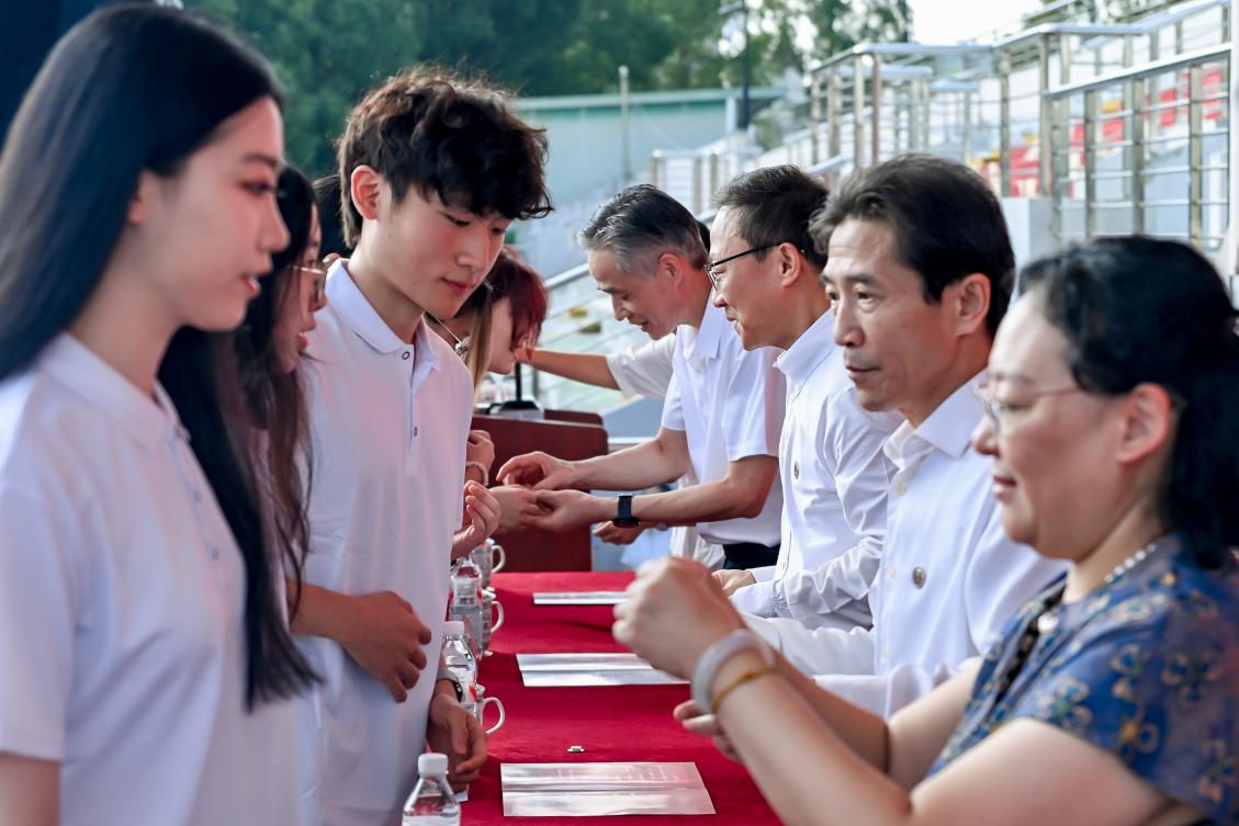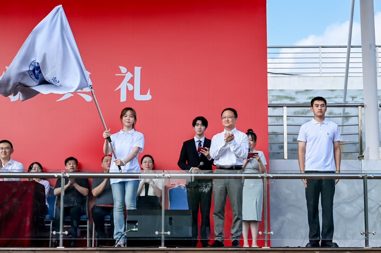校旗凝聚着学校荣誉、传统与一代代上商人的精神追求,仪式中,党委书记沈大明为新生代表授校旗,2025级新生将赓续上商精神,勤学修德,明辨笃实,用智慧和汗水为这面旗帜增添新的光彩。