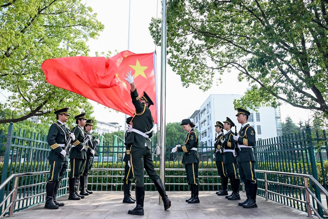 本次报到仪式由授予校旗、校长“开学第一课”、佩戴校徽、新生和教师代表发言四部分组成。仪式在庄严的升旗仪式中拉开序幕。