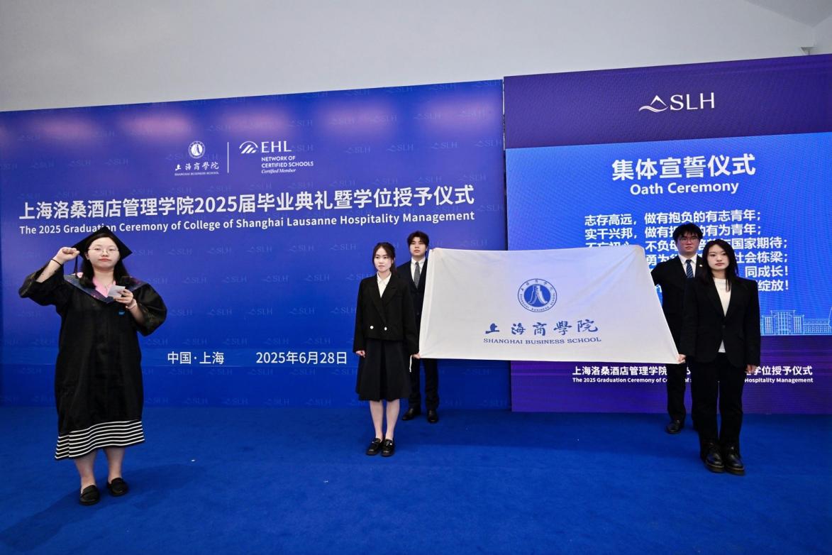 梧桐浓绿,栀子飘香。6月28日上午,上海商学院上海洛桑酒店管理学院2025届毕业典礼暨学位授予仪式于漕宝路校区隆重举行。作为中瑞深度合作办学的标杆项目,学院作为EHL认证院校联盟成员,承袭百年教育底蕴与上海商学院本土化办学优势,历经四年精心培育,迎来首批毕业生。EHL集团首席学术官胡安·F.佩雷隆,上海商学院校长吴忠,党委副书记、副校长劳晓芸、东湖集团副总经理彭立俊、锦江集团副总裁周维、携程集团副总裁王强以及各相关单位领导,教师代表、后勤服务职工代表,全体2025届毕业生及家长代表出席毕业典礼,共同见证2025届毕业生圆满完成学业,为他们即将开启的璀璨未来送上真挚祝福。典礼由学院执行院长胡笑寒、毕业生代表吴中岳主持。以“瑞辉同耀忆菁莪、瑞沪师韵铭心灯、瑞风韶华启新程”三篇章,勾勒出了首届学子从求学问道到逐梦远航的成长轨迹。